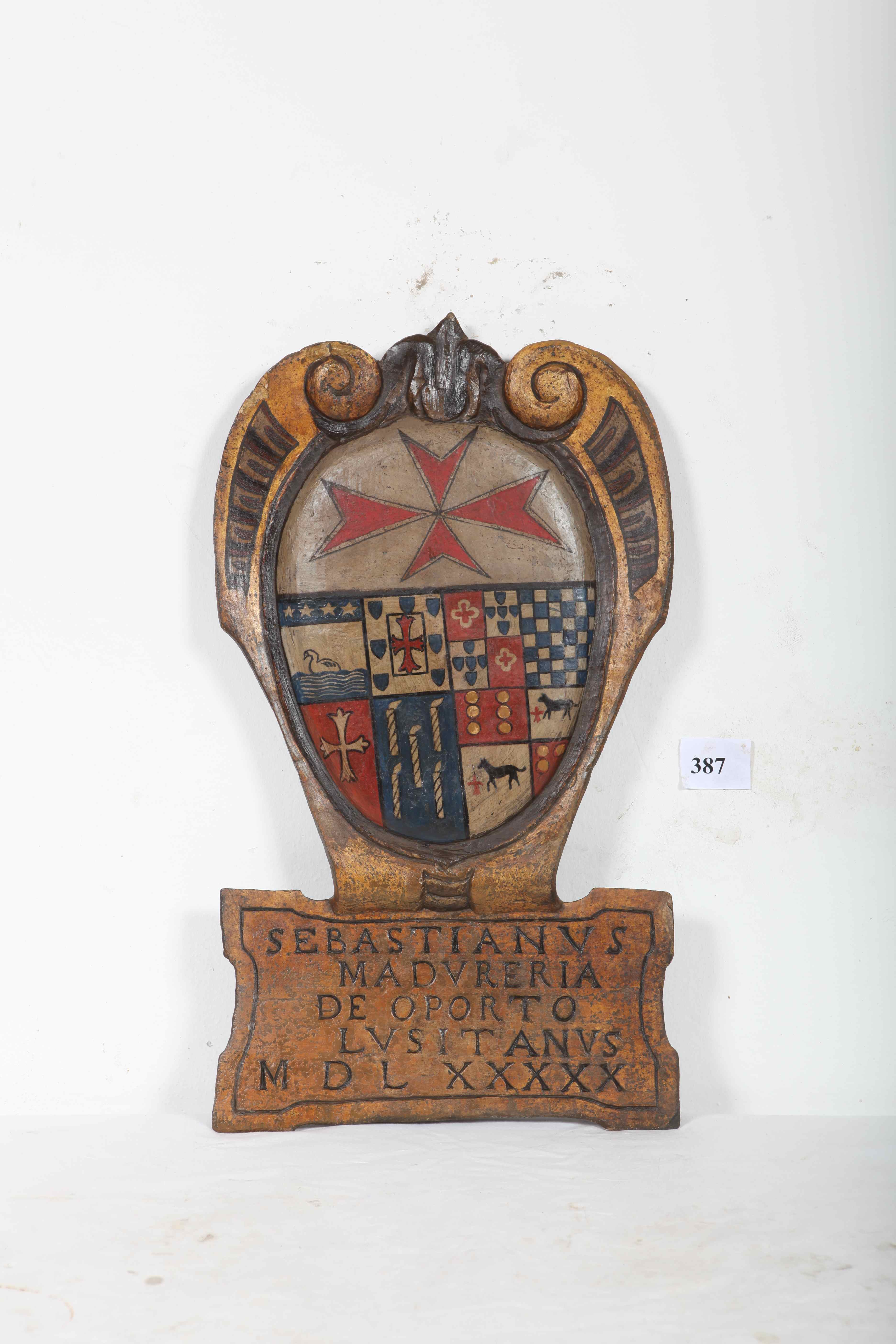 Blasonatura Partito: nel primo inquartato: in a) d'azzurro, al cigno d'argento, natante sul mare al naturale, accompagnato da sette stelle di otto raggi d'oro affiancate in capo (Cirne); in b) d'argento, alla croce fioronata e vuota di rosso; alla bordura d'argento, caricata da dodici quinas (Albergaria); in c) di rosso, alla croce fioronata e vuota d'argento (Pereira); in d) d'azzurro, a cinque candele d'argento poste in decusse, ardenti di rosso (Brandao); nel secondo semipartito troncato; in a) inquartato: in 1) e IV) di rosso, al lunello d'argento; in II) e III) d'argento, a cinque quinas posti in croce (Sousa); in b) scaccato di sei per cinque pezzi d'argento e d'azzurro (Sà); in c) inquartato: in I) e IV) di rosso, a sei bisanti d'oro posti 2, 2, 2; in II) e III) d'argento, al levriero di nero, addestrato da un giglio di rosso; il tutto abbassato sotto il capo di Santo Stefano Scudo ovale entro cartiglio modanato con cartella posta nella parte inferiore Non sono conservati gli stemmi nelle relative Provanze