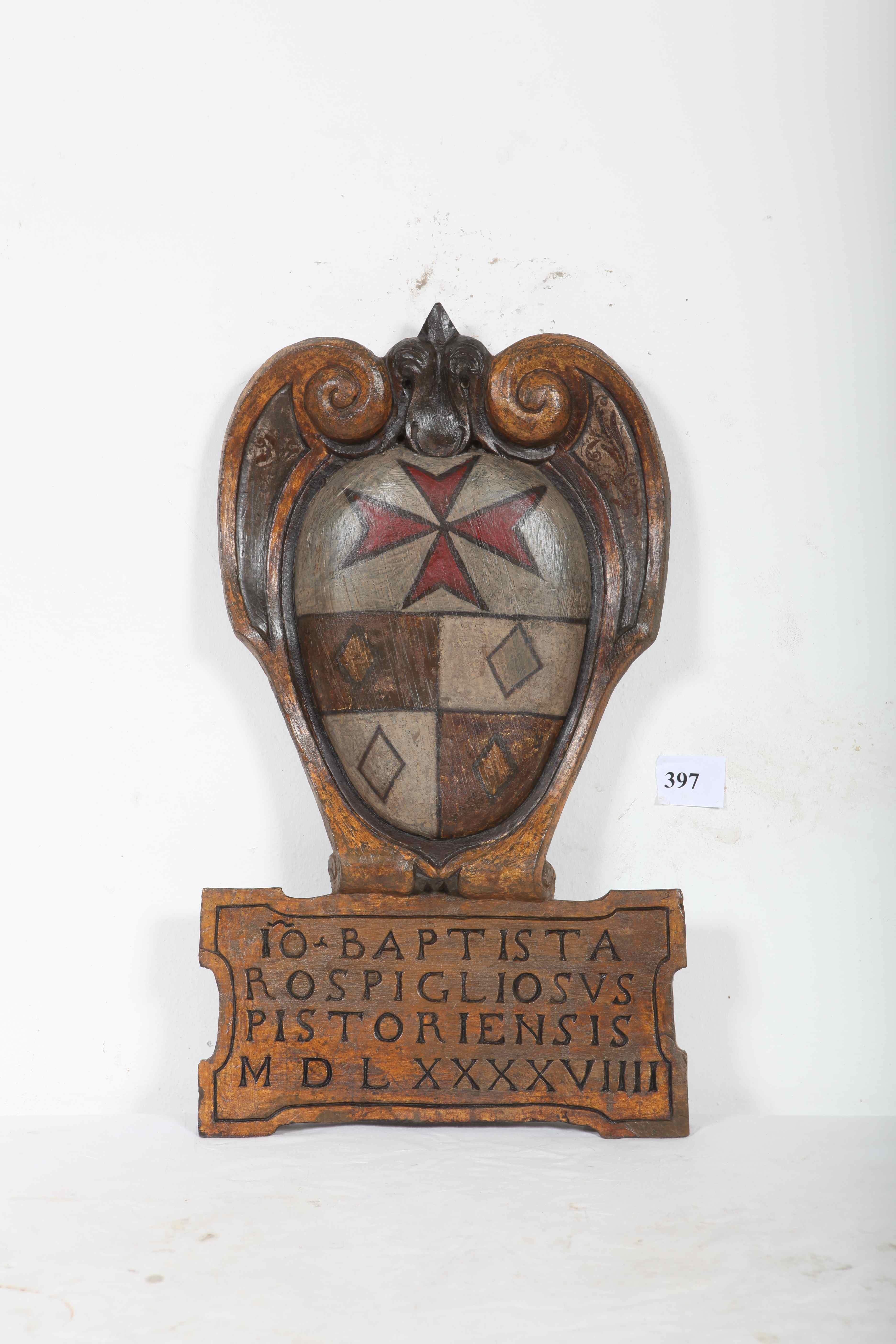 Pietra; Mista/ biacca a olio (fondo scudo) e tempera grassa (decorazione) e oro a conchiglia