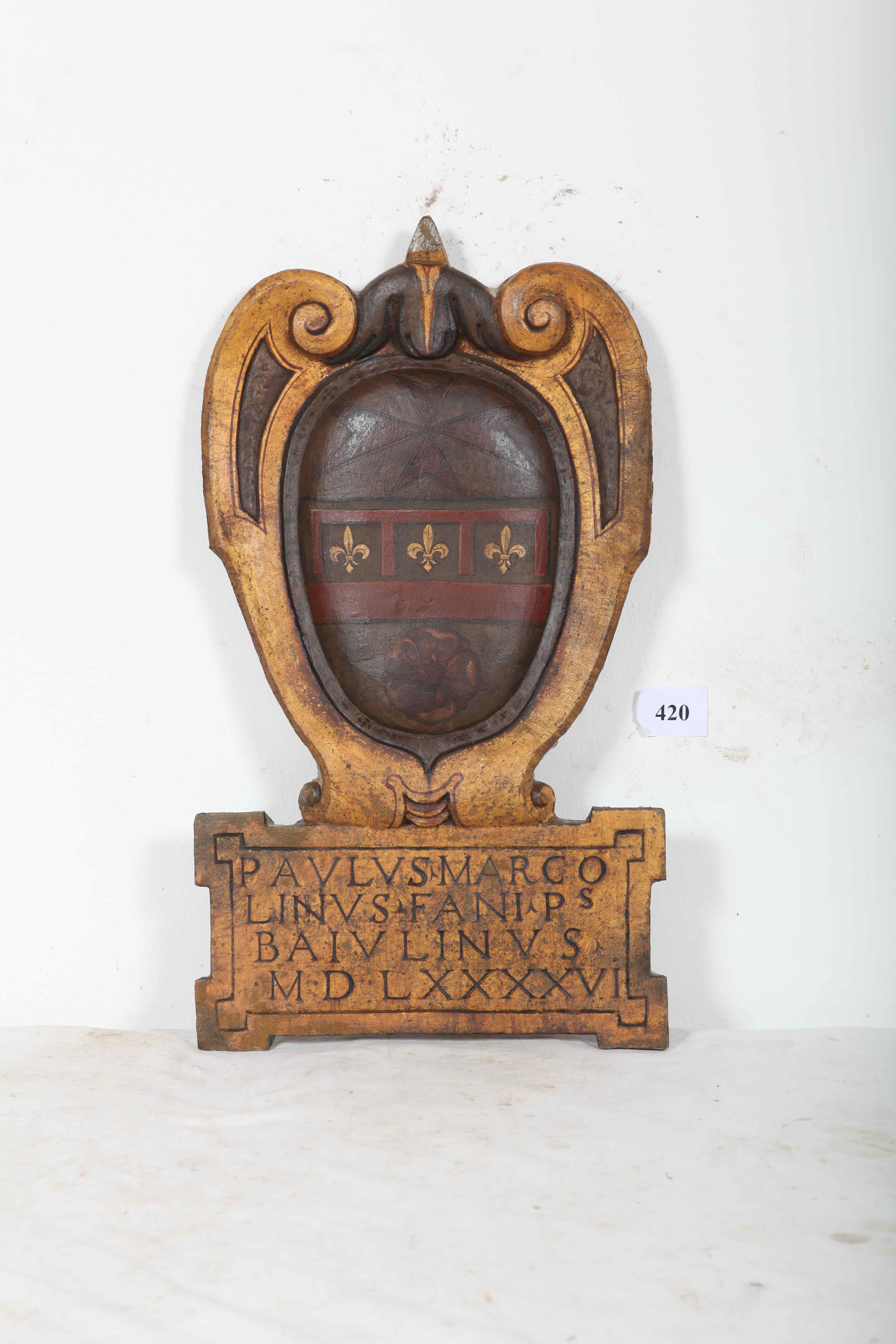 Pietra; Mista/ biacca a olio (fondo scudo) e tempera grassa (decorazione) e oro a conchiglia