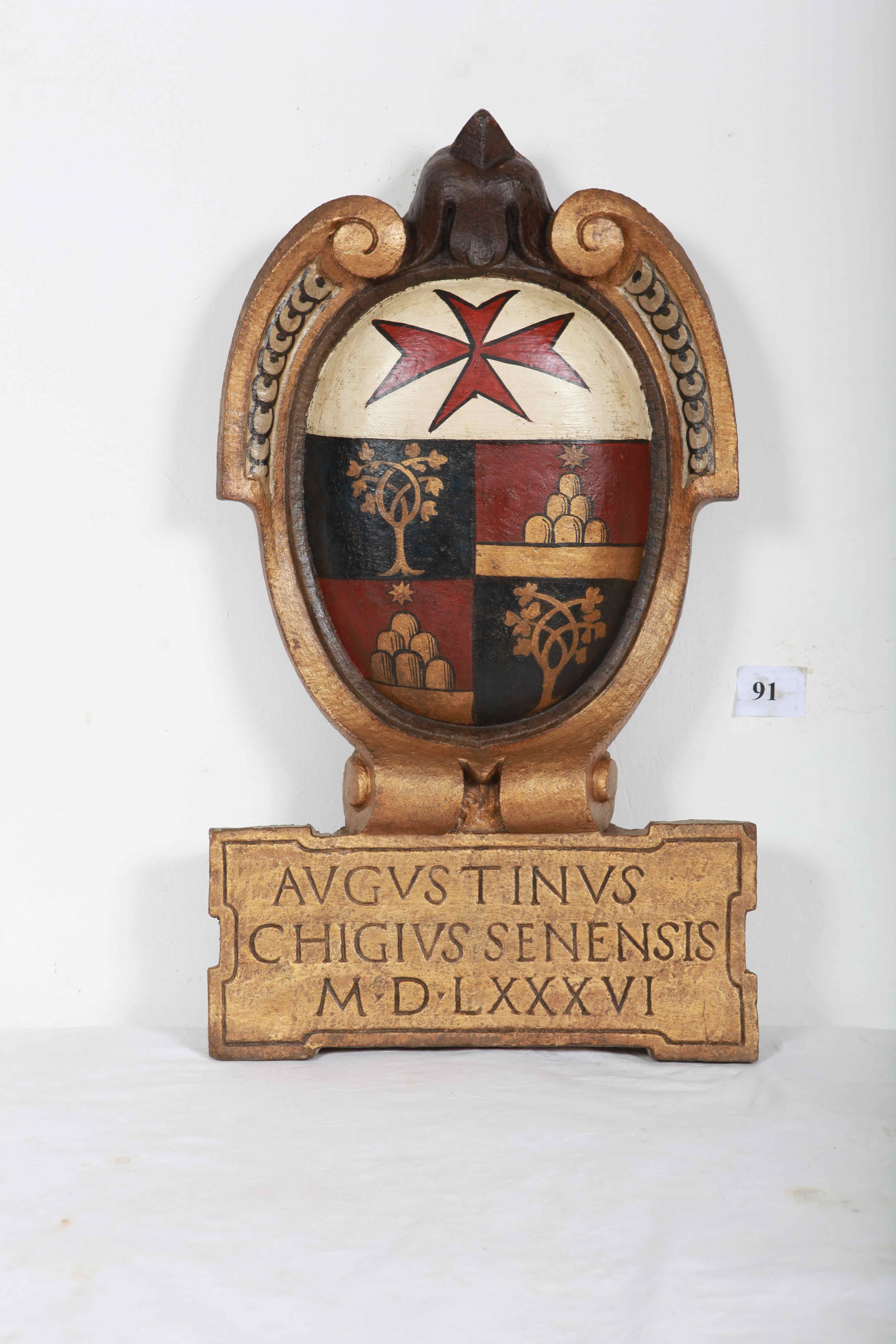 Borgia 1988, p. 67 Dati materiali e tecnici Pietra; Mista/ biacca a olio (fondo scudo) e tempera grassa (decorazione) e oro a conchiglia Altezza 69 cm - Larghezza Sc. 39 cm, Cart. 41 cm - Spessore 8 cm Anno restauro 2012